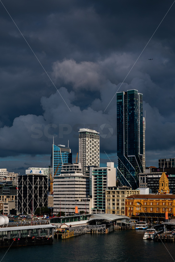 Downtown Ferry Terminal & Auckland CBD during stormy weather quantity